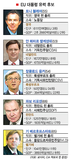 지난주 개최된 유럽연합(EU) 정상회담을 계기로 리스본 조약에 따라 신설되는 EU 대통령직을 누가 맡을 것인지에 대한 궁금증이 커지고 있다. 하지만 상황은 안갯속으로 빠져드는 분위기다. 최근에는 토니 블레어 전 영국 총리 ‘대세론’이 수그러들면서 다른 후보들이 부상하고 있다.