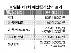 1차 심의의 결과는 32개 사업의 폐지로 878억엔, 11개 사업의 예산집행보류로 569억엔, 56개 사업의 삭감액을 모두 합치면 4152억~5184억엔에 달했다. 또 중복됐거나 불필요하게 짜여진 각종 기금 및 특별회계 잉여금인 이른바 ‘매장금(埋臟)’이 9139억엔이다.