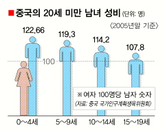 중국의 출생 남녀 성비 불균형은 1980년대부터 본격화됐다. 2005년 조사에서 0~4세의 남녀 성비는 무려 122.66(여아 100명당 남아 숫자)으로 국제평균인 107을 크게 초과했다. 여자 아이 100명이 출생할 때 남자 아이는 123명이 태어났다는 얘기다. 하이난(海南)성의 경우 무려 135로 조사됐다. 이런 추세는 연령이 높아질수록 차츰 줄어들어 15~19세 연령대의 경우 107.8로 평균치를 약간 상회했다.