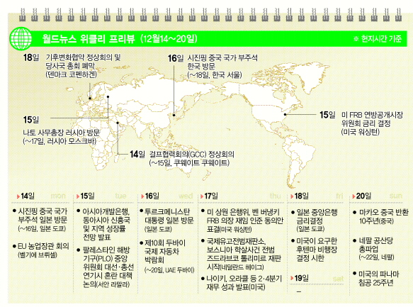 이번 주(12월14~20일)에는 제15차 기후변화협약 당사국 총회가 열리고 있는 덴마크 코펜하겐에 110개국 정상들이 모여 지구온난화 문제와 자국의 이익을 놓고 최종 저울질을 할 예정이다. 총회 마지막 날인 18일 열리는 정상회담에서 무사히 합의문이 채택될지 이견만을 확인한 채 구호만 외치고 끝날지 주목된다.