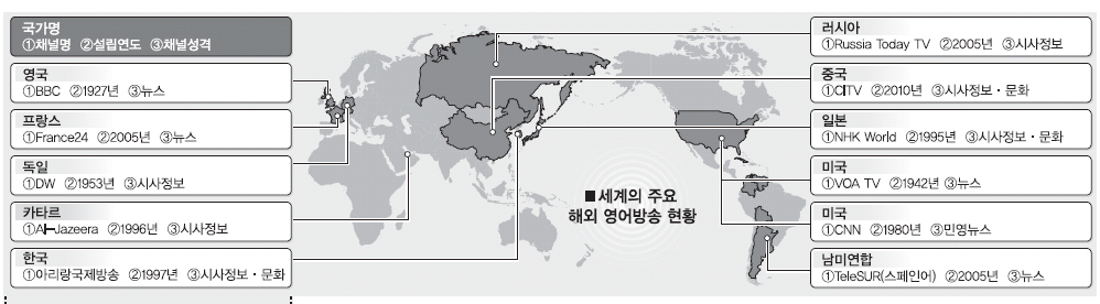 한국은 1990년대부터 영어 국제방송을 위해 아리랑국제방송을 운영하고 있다. 하지만 취약한 법적 위상, 재정지원 부족, KBS가 후발주자로 나서면서 발생한 역할중복과 비협조 문제 등으로 어려움을 겪고 있는 형편이다.