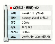 │베이징 박홍환특파원│지난 21일 중국 랴오둥(遼東)반도의 중국 인민해방군 모 연안 미사일 부대에서 중국의 대함(對艦) 순항미사일 YJ-62 두 발이 시험발사됐다. 발사된 미사일들은 수백㎞ 떨어진 바다 위 목표 함정에 정확히 명중했다. 중국 군 기관지인 해방군보(解放軍報)가 간단하게 보도한 이 소식이 타이완(臺灣)과 미국의 신경을 건드리고 있다. 중국의 연안 미사일부대가 해상 장거리 목표를 상대로 시험발사한 것은 이번이 처음이다.