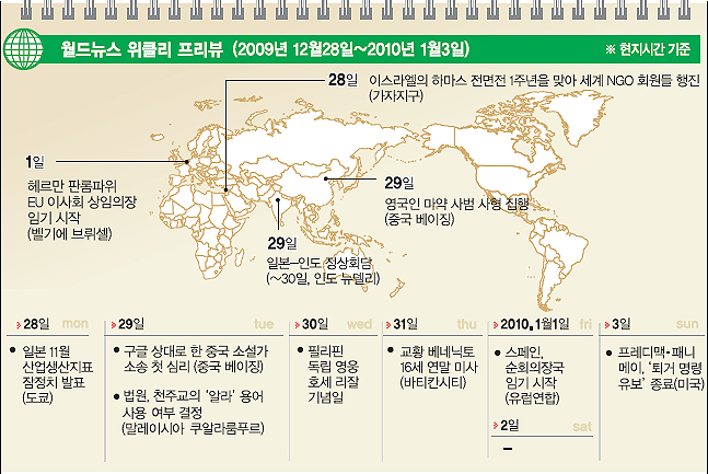 이번 주(12월28일~1월3일)에는 전 세계가 2009년을 뒤로하고 새해 맞이에 나선다. 경기 침체와 연말 지구촌 곳곳에서 벌어진 테러 등으로 어수선한 분위기 속에서 2010년을 시작할 것으로 보인다. 미국의 국책 모기지 회사인 패니메이와 프레디맥은 오는 20 10년 1월3일까지 강제 차압과 퇴거를 유예한다. 지난 19일부터 시작된 이번 조치는 가뜩이나 우울한 연말, 연초를 거리가 아닌 집에서 보낼 수 있도록 배려한 것이다.