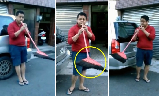 영상은 장씨가 반바지 차림에 슬리퍼를 신고 길에 세워진 차에 기댄 채 편안한 자세로 서 있는 모습으로 시작된다. 이어 장씨는 빗자루 손잡이를 입에 갖다댄 채 볼에 바람을 잔뜩 넣고 있다.