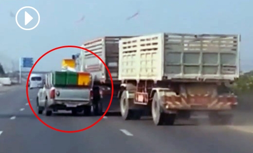 2분 40여초 분량의 영상에는 편도 4차로 중 1차로를 달리는 화물차 한 대가 픽업트럭 뒤를 바짝 쫓아가는 모습이 유독 눈에 띈다. 잠시 후 화물트럭 운전자가 서행운전하는 픽업트럭이 맘에 들지 않았던지 추월을 시도한다.