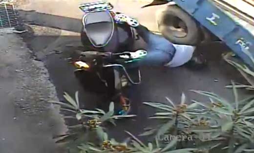 3분 길이의 영상을 보면 화물트럭에 부딪힌 오토바이 운전자가 바닥에 쓰러지면서 시작된다. 이어 화물트럭의 한쪽 바퀴가 오토바이 운전자 머리를 아슬아슬하게 치고 지나간다. 남성의 부상이 염려되는 상황.