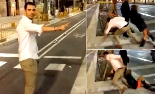 스페인에서 한 남성이 횡단보도에 서 있는 여성을 뒤에서 발로 걷어차 쓰러뜨리는 사건이 발생했다. 묻지마 폭행인 셈이다.
