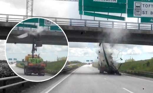 영상을 보면 굴삭기를 싣고 도로를 달리고 있는 트럭 한 대를 볼 수 있다. 잠시 후 이 트럭은 고속도로 위를 가로지르는 고가도로 하단을 통과한다. 이때 트럭에 실려 있던 굴삭기의 암 부분이 고가 상판과 충돌하면서 위험천만한 사고로 이어진다.