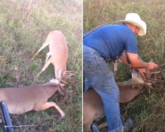 영상에는 미국 텍사스주 플렛저의 한 목장에서 싸우다 뿔이 뒤엉킨 사슴의 모습이 담겨 있다. 남성은 서로 머리를 맞대고 옴짝달싹 못 하고 있는 사슴을 떼어내려 애쓴다. 잠시 후, 남성의 노력 끝에 엉켜있는 뿔들을 풀리자 사슴들은 쏜살처럼 뛰어 들판으로 달아난다.