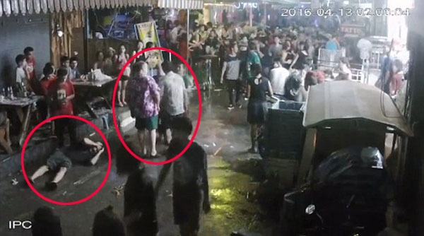남성의 밀침에 아들이 쓰러지자 함께 있던 60대 부모가 남성에게 항의하기 시작한다. 남성의 일행으로 보이는 또 다른 남성이 나타나 아빠의 얼굴을 가격한다. 이어 이를 항의하던 엄마의 얼굴을 주먹으로 강타한다. 떼 지어 나타난 태국 청년들은 의식을 잃고 쓰러진 영국인 가족을 발로 걷어차며 무자비한 폭행을 가한다. 폭행 후 청년들이 자리를 뜨자 인근 사람들이 뛰어와 영국인 가족의 상태를 살핀다.