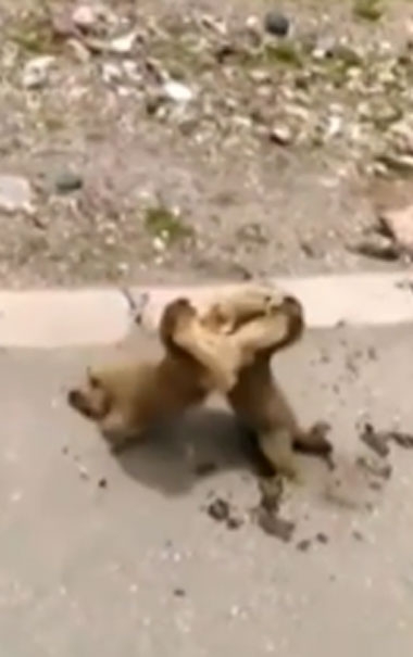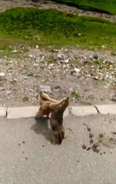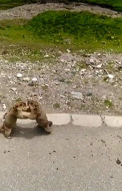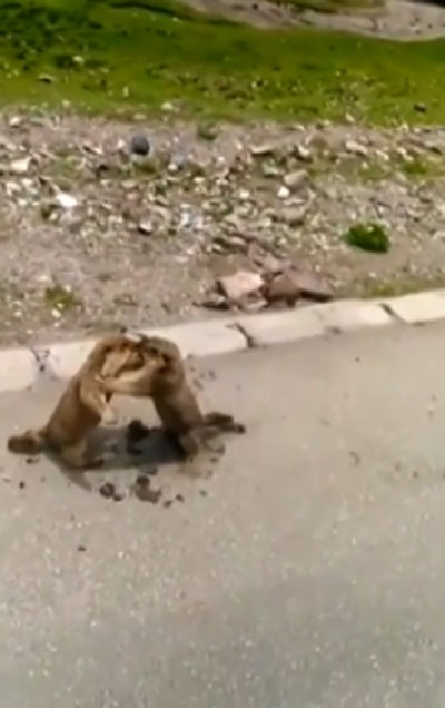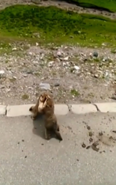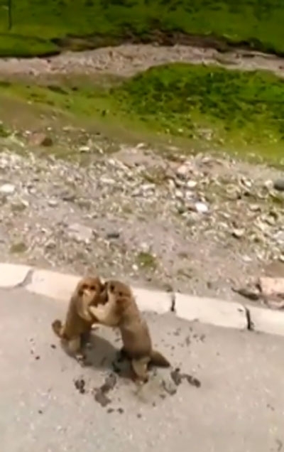 지난 2일 중국 칭하이성 남부 유슈 티벳 자치구의 한 산 중턱 도롯가에서 서로 싸움하는 거대 다람쥐 마못의 모습이 촬영됐습니다. 주행 중이던 버스의 한 승객이 찍은 영상에는 커다란 히말라야 마못 두 마리가 두 발로 선 채 서로의 얼굴을 가격합니다. 마치 사람이 권투시합을 하듯 서로 인정사정없이 주먹을 주고받습니다.
