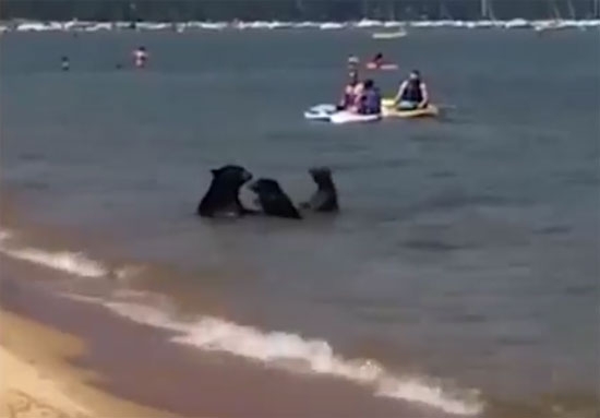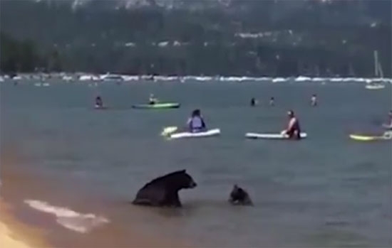 영상에는 패들보드와 수영을 즐기는 사람들 사이 호숫가 얕은 물에서 수영을 즐기는 곰 세 마리의 모습이 보인다. 두 마리의 새끼 곰은 일어선 채 마치 어린애처럼 서로 장난을 치며 놀고 있다.