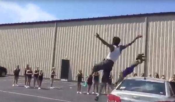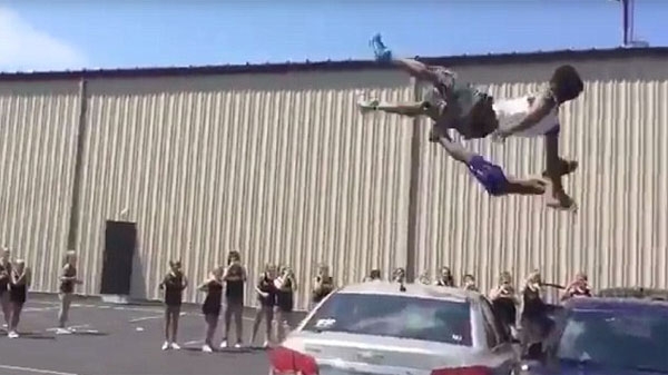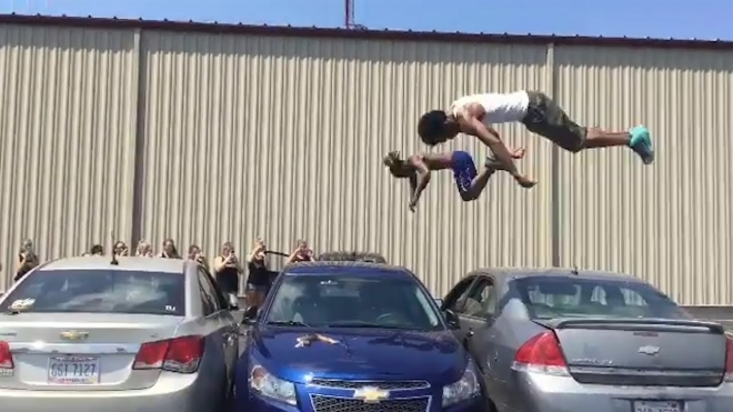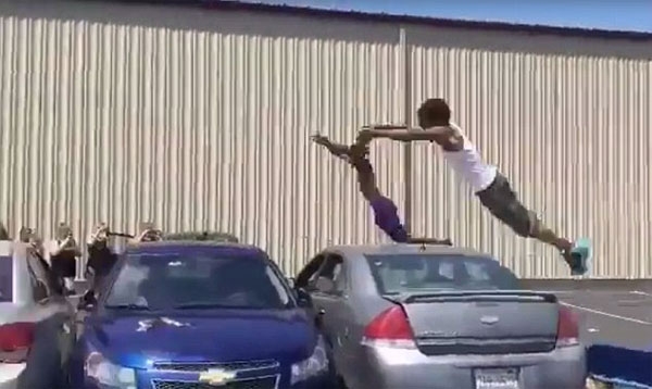 영상에는 두 명의 10대 소년이 작은 도약대를 밟고 차량 3대를 뛰어넘은 뒤, 회전하며 공중제비를 펼치는 모습이 담겨 있다. 두 소년의 묘기에 이를 지켜보던 학생들이 박수와 환호를 보낸다.