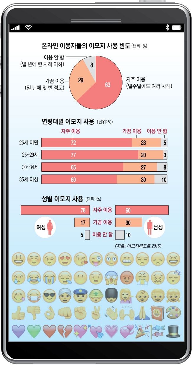 영국의 옥스퍼드 사전이 매년 12월에 선정하는 올해의 단어는 시대 변화를 빠르게 반영하는 것으로 유명하다. 2013년에는 ‘셀프카메라’를 뜻하는 신조어 ‘셀피’(selfie)가, 2014년에는 전자담배를 피우다는 의미의 ‘vape’를 뽑는 등 대중의 관심을 정확히 파악했다. 그런 옥스퍼드 사전이 지난해 12월에 선정한 ‘2015년 올해의 단어’는 바로 ‘기쁨의 눈물이 가득 찬 얼굴’(Face with Tears of Joy) 모양의 이모지(emoji)였다. 일본어로 그림을 뜻하는 에(繪)와 문자를 의미하는 모지(文字)를 조합한 이 단어를 우리말로 풀이하면 그림문자 혹은 상형문자쯤 될 것 같다. 이모지가 올해의 단어로 선정된 것은 ‘2030’ 세대들이 페이스북과 트위터 등에서 문자 대신 이모지로 소통하는 현 시대를 읽었기 때문이다.