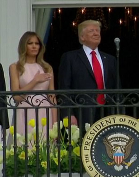18일(현지시간) 영국 데일리메일 등 주요 외신들은 지난 17일 백악관 ‘이스터 에그롤’(달걀 굴리기) 행사에서 국기에 대한 경례를 안 하는 트럼프 대통령에 신호를 보내는 영부인 멜라니아의 모습이 포착됐다고 보도했다.