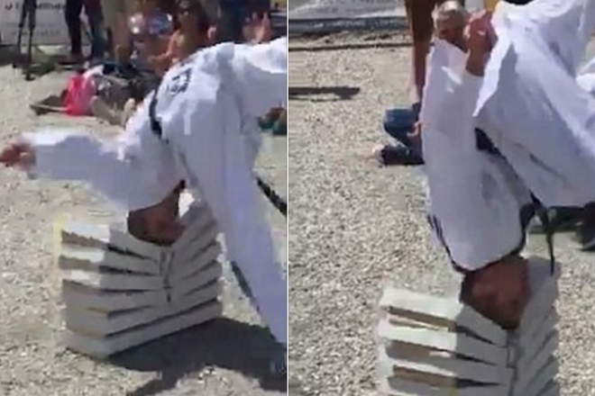 아흐메드스파히치는 줄줄이 늘어선 콘크리트 벽돌을 머리로 내리찍으며 공중제비를 통해 전진했다.