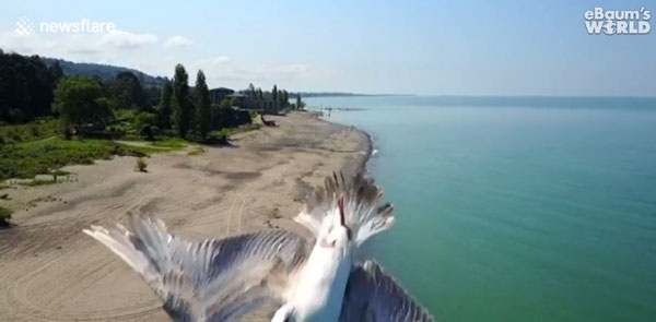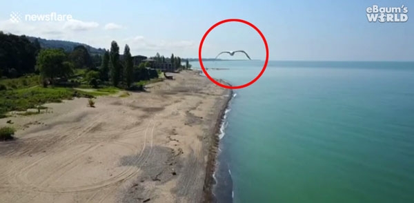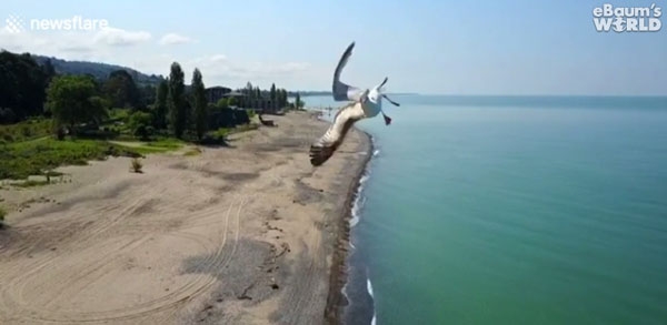 상공에서 해변을 촬영 중인 드론에 멀리서 드론 한 마리가 날아옵니다. 드론과 가까이서 마주한 갈매기는 급히 몸을 틀어 드론을 피합니다. 하마터면 공중에서 드론과 갈매기가 충돌할 뻔한 아찔한 순간이었네요.
