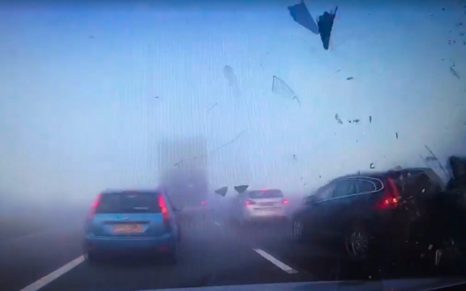 영상에는 크리스가 이날 안개 낀 고속도로를 달리다 경험한 교통사고 현장이 담겼다. 옆 차선을 달리던 차는 안개 탓에 미처 앞차를 보지 못하고 추돌 사고를 낸다. 엎친 데 덮친 격으로 다른 차들도 줄줄이 추돌사고를 내면서 도로는 아수라장이 된다.