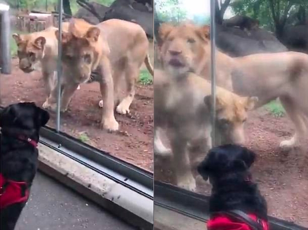 동물원 유리벽을 사이에 두고 마주한 안내견과 사자의 반응을 담은 영상이 화제에 올랐다.