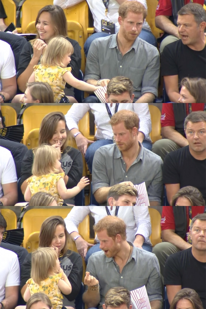영국 해리 왕자(32)의 팝콘을 태연하게 집어먹는 여아의 모습이 중계 카메라에 잡혔다.