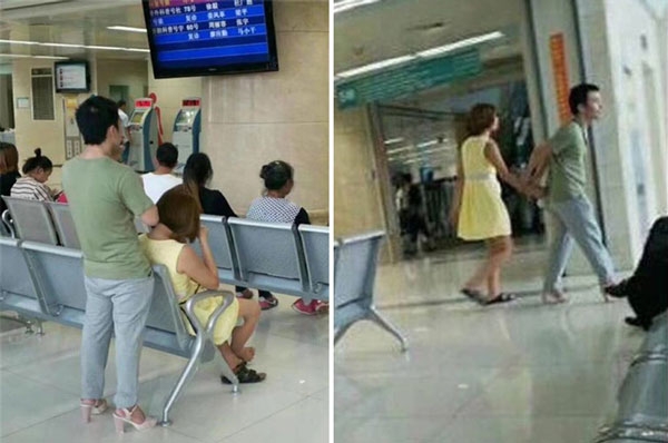 해당 사진은 중국 충칭 샤핑바의 싱챠오 대학병원에서 포착된 것으로 한 남성이 진료 대기 중인 여자 친구의 하이힐을 바꿔 신은 채 서 있는 모습이 담겼다. 여성은 남자 친구의 편안한 샌들을 신고 앉아 있으며 남성은 샌들 대신 굽이 높은 분홍색 구두를 신고 여자 친구 곁에 서 있다.
