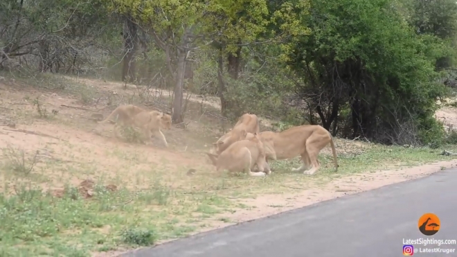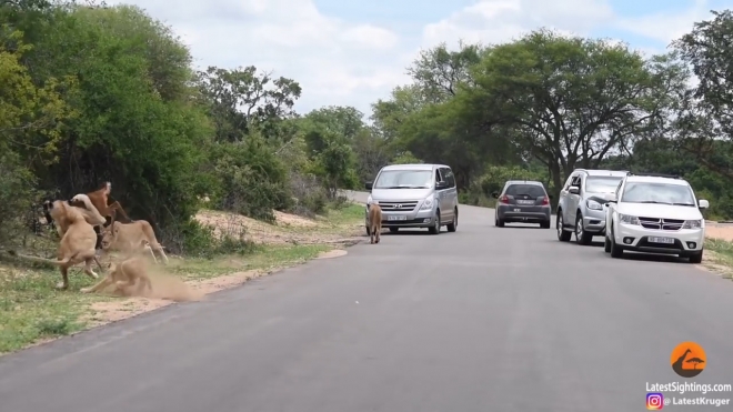 영상에는 도로 위를 어슬렁거리던 사자 무리 뒤로 때마침 사슴 한 마리가 뛰어가는 순간이 담겼다. 사자들은 순식간에 사슴을 덮쳐 제압하고는 한 곳에 모여들어 허기를 달랜다.