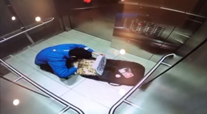 영상은 엘리베이터 안에 있는 피자 배달부가 문을 닫으면서 시작한다. 이 배달부는 엘리베이터 문이 닫히기도 전에 서둘러 배달 가방에서 피자를 꺼낸다. 피자를 꺼내는 동작과 문이 닫히는 동작이 정확히 일치하는 걸로 봐서 ‘동일 전과’가 다수 있었음을 짐작할 수 있다.