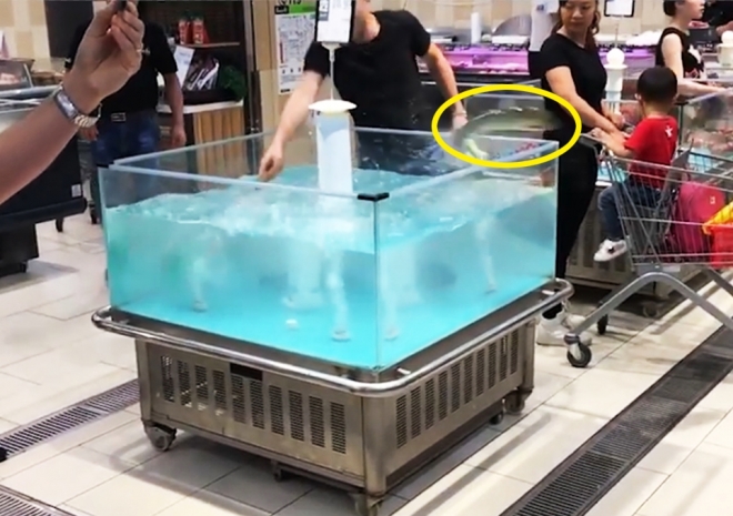 쇼핑객에 의해 우연히 촬영된 영상엔, 한 수산물 점원이 그물로 물탱크를 이리저리 휘젓다 물고기 한 마리를 발견하고 바로 건져내려 한다.