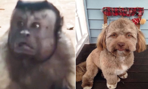 왼쪽-중국 동북부 천진 동물원의 영장류,오른쪽-사람 얼굴 빼닮은 미국 샨탈 데자르딘스씨의 3살 강아지 ‘요기(Yogi).