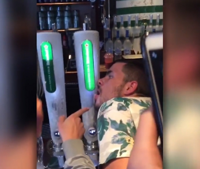 주인공은 리스 레빈슨(Reece Levinson)이란 남성이다. 그가 왜 이런 무모한 행동을 했는지 정확히 알려지진 않았다. 아무튼 술이 거나하게 들어간 그는 얼음처럼 차가운 냉동맥주 펌프에 그의 혀 끝을 갖다 대고 본드 묻은 물건처럼 그의 혀가 냉동펌프에 달라붙게 된 것이다.