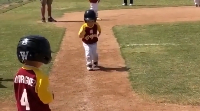 영상 속, 야구복장에 헬멧을 쓴 한 아이가 홈플레이트로 걸어오고 있는 모습이다. 하지만 아이가 걸어오는 속도가 느려도 너무 느리다. 자신이 홈으로 들어오는 모습을 많은 사람들에게 더 많이 보이고 싶었던지 손과 발동작에 온 힘을 싣고 걸음 하나하나에 초집중하고 있는 모습이다. 어찌 그리 사랑스러운지 보는 이의 입가에 웃음을 자아내기에 충분하다.