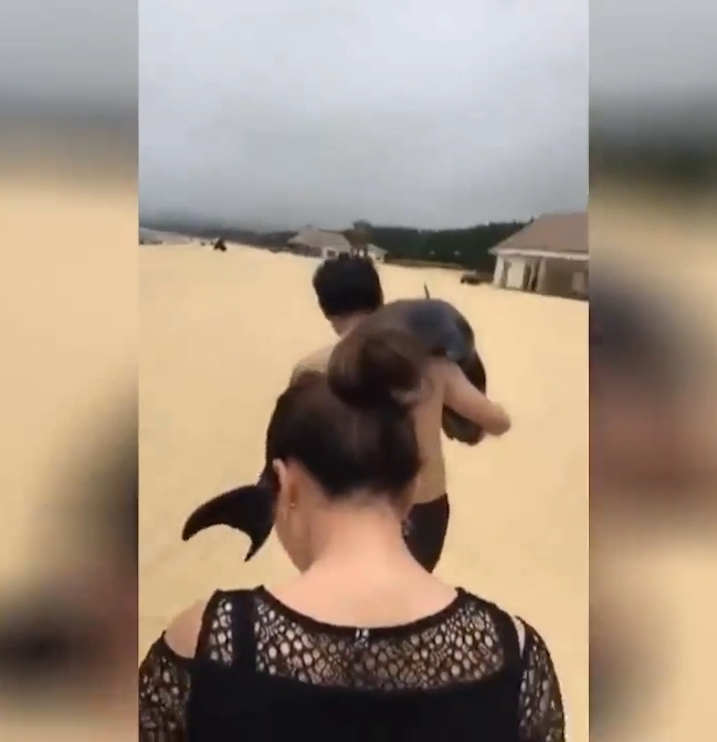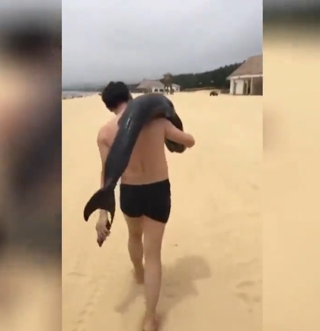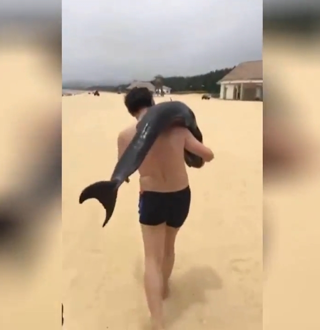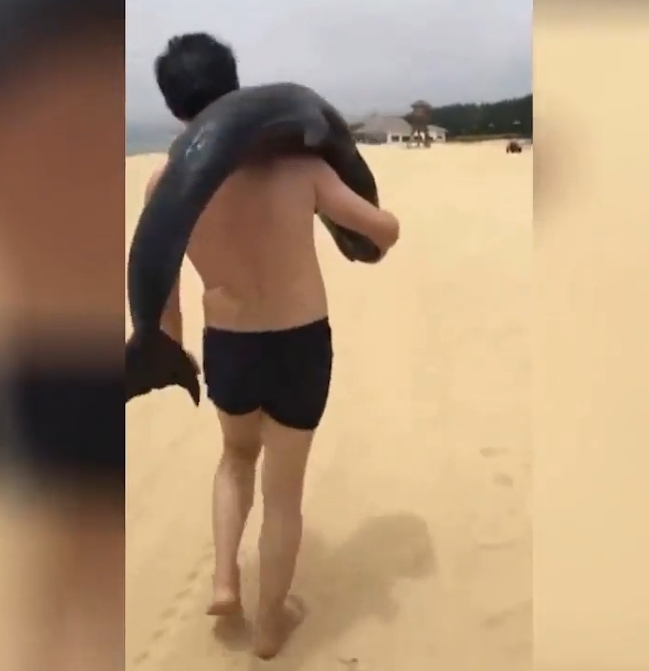 지난 1일(현지시각) 촬영된 영상엔 중국 광둥성(Guangdong) 양지앙(Hailing Island) 휴양지의 해변을 따라 걷고 있는 한 남성을 보여주고 있다. 놀라운 것은 남성 어깨 위로 힘없이 축 늘어져 있는 돌고래 한마리의 모습 때문이다.