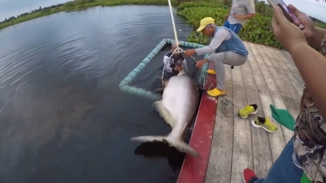 길이 2.1미터, 무게 170킬로그램의 초대형 메기가 잡혔다.