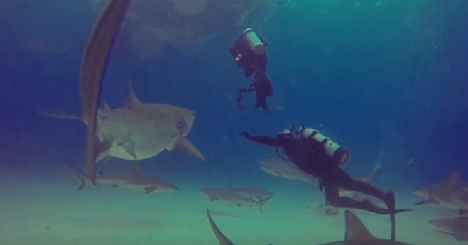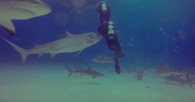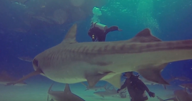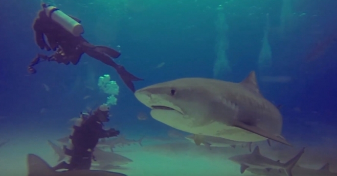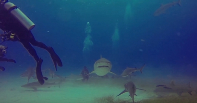 영상에는 상어들로 가득한 바닷속에서 전문 다이버 엘리 마티네즈(Eli Martinez)의 지도하에 수중 교육을 받는 다이버 조 왕(Joe Wong)의 모습이 담겼다.