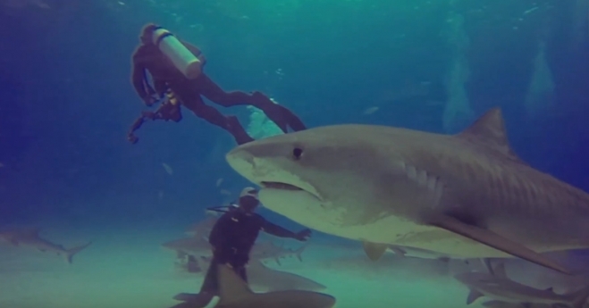 4일(현지시간) 영국 일간 데일리메일은 카리브해 바하마 제도 타이거 해변에서 뱀상어(tiger shark)가 다이버를 공격하려는 순간이 담긴 영상을 소개했다.