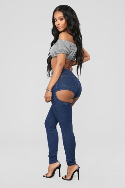 이 고전적인 스키니 청바지는 앞면에서 보면 일반 다른 청바지들과 다를 게 없다. 하지만 뒤면에는 예상치 못한 놀라운 반전이 숨어 있다. 양쪽 엉덩이 아랫부분이 절개돼 속살이 고스란히 노출된다.