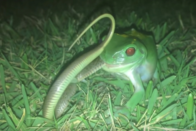 영상에는 초록청개구리가 호주 켈백 뱀(Australian keelback)의 머리 부분을 삼키고 있는 것으로 시작된다. 개구리는 앞발을 이용해 뱀의 몸통을 꾸역꾸역 입안으로 밀어넣는다. 뱀은 열심히 몸을 뒤틀며 저항해보지만 쉽지 않아 보인다.