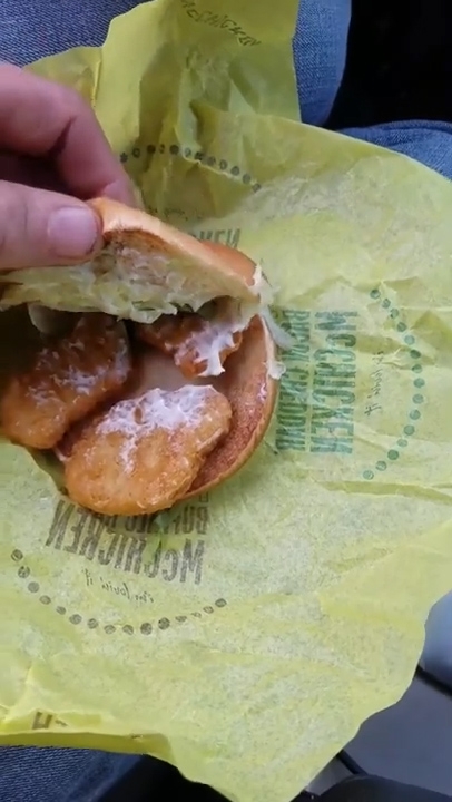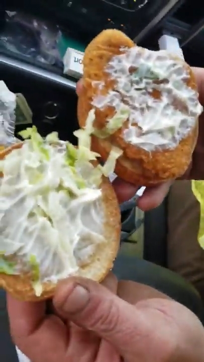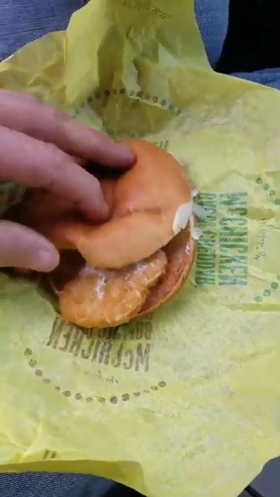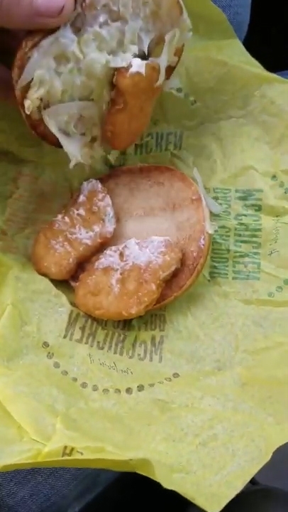차 안에서 한 남성이 주문해 받은 맥도널도 두 개의 치킨버거 속 내용물을 하나씩 확인한다. 일단 첫 번째 치킨버거는 정상이다. 빵보다 약간 작은 크기의 치킨패티 위에 마요네즈와 채소가 잘 올려져 있다. 하지만 두 번째 빵을 열어보니, 말 문이 막힌다.