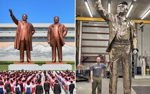 도널드 트럼프 미국 대통령의 두 번째 당선을 기념하는 동상을 제작하고, 밈코인을 발행한 이들이 2026년 말 주요 20개국(G20) 정상회의가 열리는 플로리다주 마이애미 외곽의 ‘트럼프 내셔널 도럴’ 골프 리조트에 받침대 포함 약 7m 높이의 ‘트럼프 동상’(사진 오른쪽)을 세운다. 동상은 2024년 7월 당시 공화당 대선 후보였던 트럼프가 펜실베이니아주 버틀러 유세에서 암살 시도를 겪은 직후 주먹을 치켜든 장면을 바탕으로 제작됐다. 왼쪽은 북한 평양 만수대 언덕의 김일성·김정일 동상. 조각가 앨런 코트릴 인스타그램/평양 조선중앙통신 연합뉴스