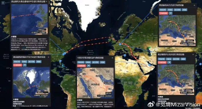 중국 인공지능·위성 영상 분석 스타트업 ‘미자르비전’이 분석한 미국 C-17 수송기의 중동 보급 경로. 웨이보 캡처
