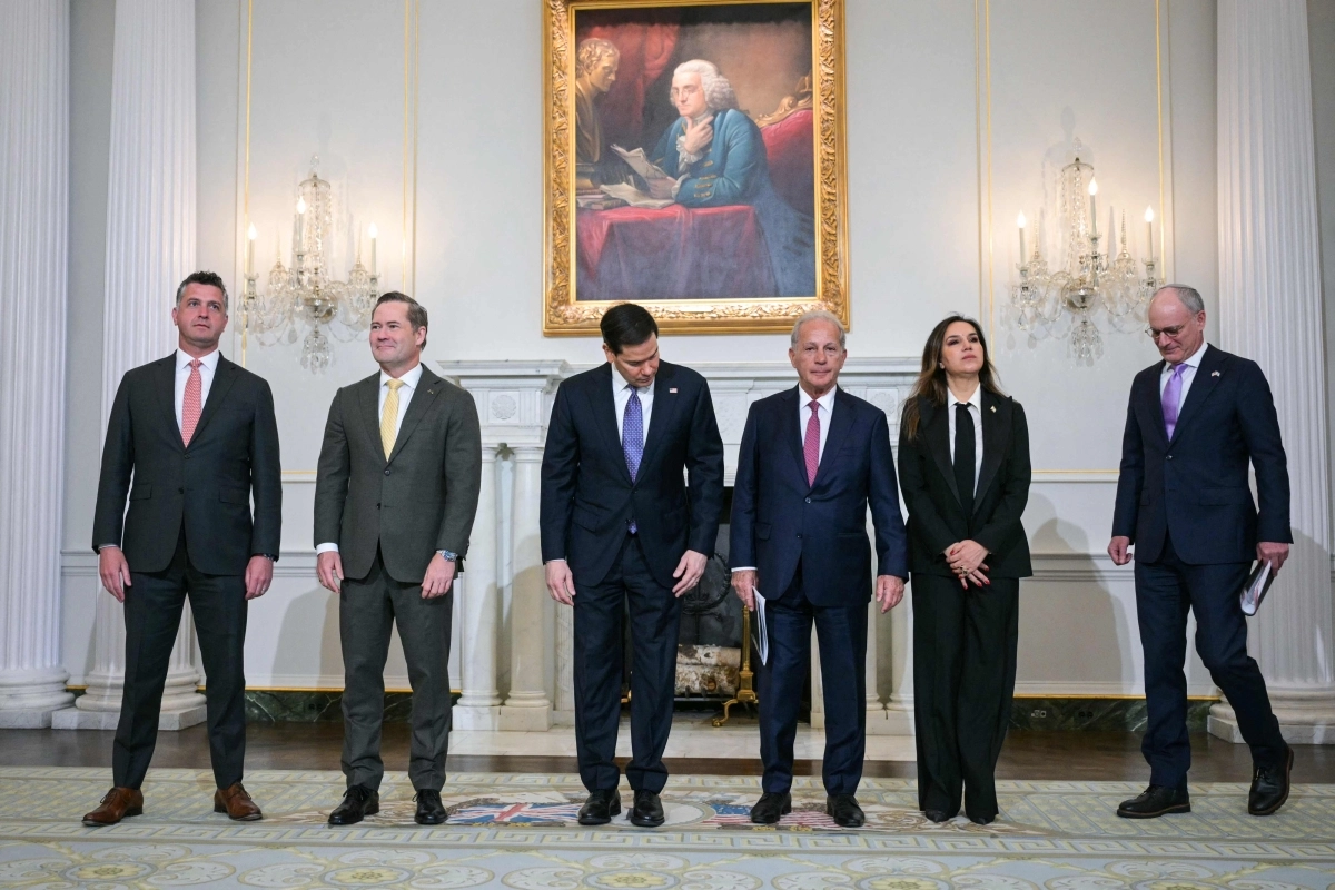미국 워싱턴DC 국무부에서 14일(현지시간) 33년 만에 열린 이스라엘과 레바논의 고위급 회담에 앞서 참석자들이 기념촬영을 하고 있다. 왼쪽부터 마이클 니덤 국무부 고문, 마이클 왈츠 유엔 주재 미국 대사, 마코 루비오 국무장관, 미셸 이사 주레바논 미국 대사, 나다 하마데 모아와드 주미 레바논 대사, 예키엘 라이터 주미 이스라엘 대사.