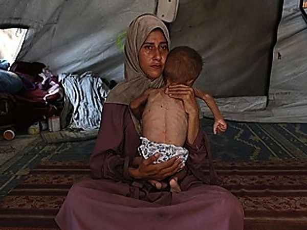 뼈가 앙상한 아기 안고 있는 가자지구의 한 주민. AFP연합뉴스