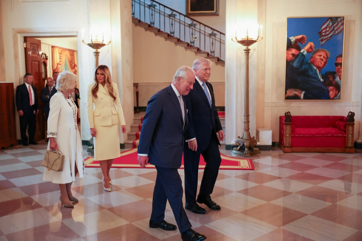 도널드 트럼프(오른쪽) 미국 대통령과 미국을 국빈 방문한 찰스 3세 영국 국왕이 27일(현지시간) 백악관에서 이동하고 있다. 건물 벽에 트럼프 대통령 암살 미수 사건으로 유명한 펜실베이니아 유세장 사진이 걸려 있다.