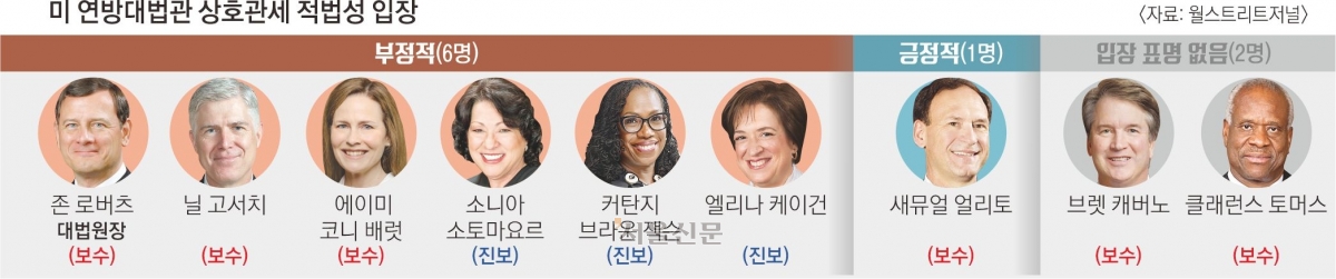 미국 연방대법원이 5일(현지시간) 도널드 트럼프 대통령이 한국 등 전 세계에 부과한 상호관세의 적법 여부를 판단하기 위한 심리에 돌입했다. 연방대법원은 6대3으로 보수 우위 구도이나 존 로버츠 연방대법원장 등 일부 보수 성향 대법관도 트럼프 행정부의 조치에 의구심을 표시했다. 월스트리트저널(WSJ)이 이날 대법관 9명 중 6명이 상호관세에 부정적 입장을 보였다고 보도하는 등 보수 대법관들 사이에서 뚜렷한 분열이 감지됐다. 이에 따라 이르면 수주 뒤 나올 대법원의 최종 판단이 주목된다.