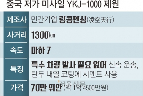 3일 홍콩 사우스차이나모닝포스트(SCMP) 보도에 따르면 지난달 25일 민간기업 링콩톈싱이 속도 마하 7에 사거리가 1300㎞에 이르지만 가격은 70만 위안(약 1억 4500만원)에 불과한 저가형 미사일 ‘YKJ-1000’을 출시했다.