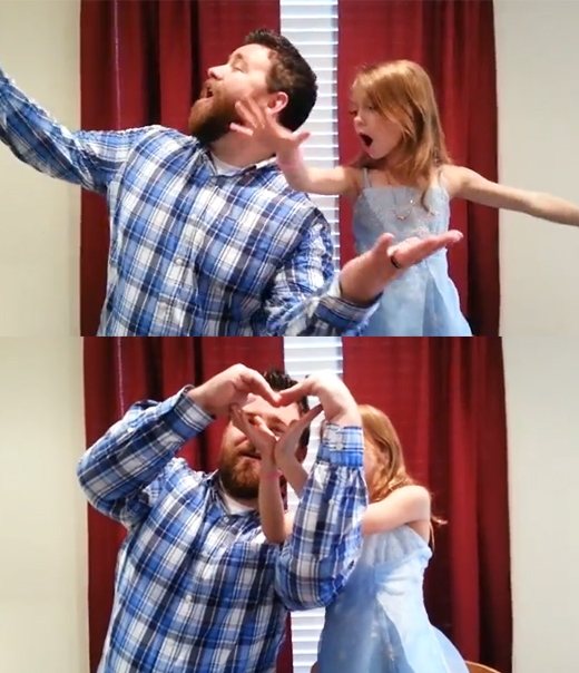 영상에서 어린아이는 겨울왕국의 공주가 입은 드레스를 입고, 아빠와 함께 립싱크뿐만 아니라 노래 가사에 맞춰 팔을 펼치는 등 사랑스러운 춤을 선보인다. 그리고 마지막에는 아빠와 함께 손으로 하트 모양을 만들어 보인다. 마음을 열고 함께 재미있는 시간을 보내는 이 부녀지간의 사랑은 실제로 활짝 ‘열린 문’인 것 같다.