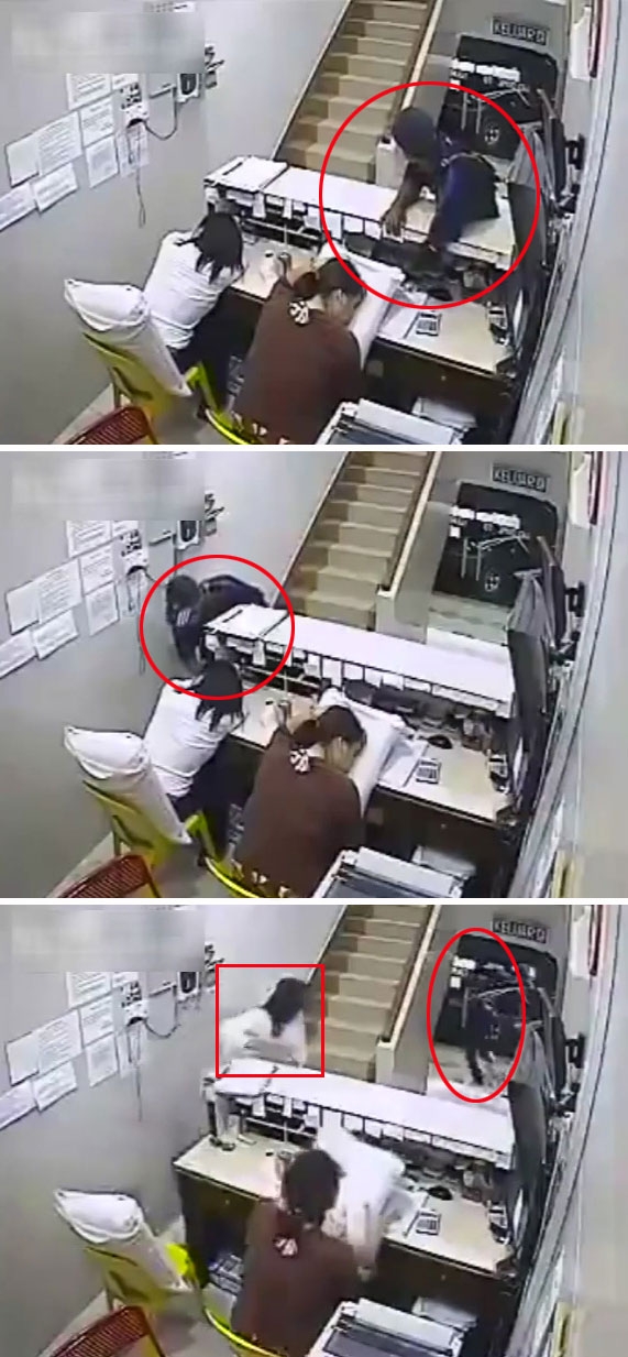 3분 14초가량의 CCTV에는 사무실 안에서 근무 중 잠든 여직원의 모습이 보인다. 모자를 눌러 쓴 남성이 조심스레 다가와 책상 안쪽을 기웃거린다. 남성은 주변 상황을 살핀 후, 책상 안쪽에서 무언가를 훔친다.