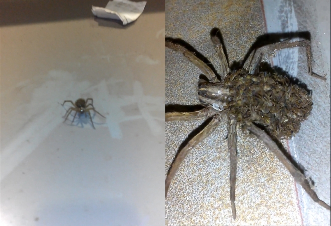 암컷 늑대거미(wolf spider)가 새끼를 등에 업고 이동하는 모습이 미국 미주리 주(州)의 한 가정집에서 포착됐다.