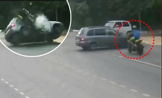 지난 9일 오후 러시아 소치의 한 도로를 달리던 오토바이 운전자가 좌회전하던 승용차 옆쪽을 들이받았다. 전방 주시 소홀과 과속이 화근이었다.
