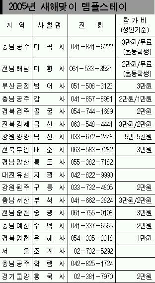 전국 18개 사찰에서는 31일∼내년 1월1일 새해맞이 템플스테이 행사를 개최한다. 등산(태화산 마곡사, 달마산 미황사, 계룡산 자광사, 조계산 송광사 등), 새해맞이 타종식(낙산사, 구룡사, 수덕사 등), 산사음악회(금산사, 수덕사 등), 떡국 나눠먹기(서울 조계사) 등 다양한 프로그램이 준비돼 있다.